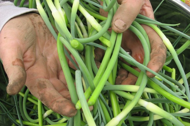 Sometimes we neglect to see the obvious. Subtleties elude us, and in our zeal to enjoy fresh hard-neck garlic, these tender flower heads were ignored. In the past they were typically given as fodder to livestock. Garlic scapes are abundant at farmer’s markets this time of the year. The window for tender scapes is only two weeks. If scapes are left on the plant too long, they become woody and lack the tenderness that gives them their appeal. Cutting them allows the plant’s energy to go directly to the bulb. Although previously ignored, the garlic scape is a delicious spring discovery. Someone realized they were edible and creativity took care of the rest.