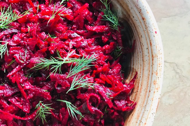 - Toss beets with the salt, pepper, oil and vinegar. Add chopped dill. Let the salad macerate on your kitchen counter for about 1 hour. Taste and adjust with more vinegar, salt or both. I like mine with a little zing.