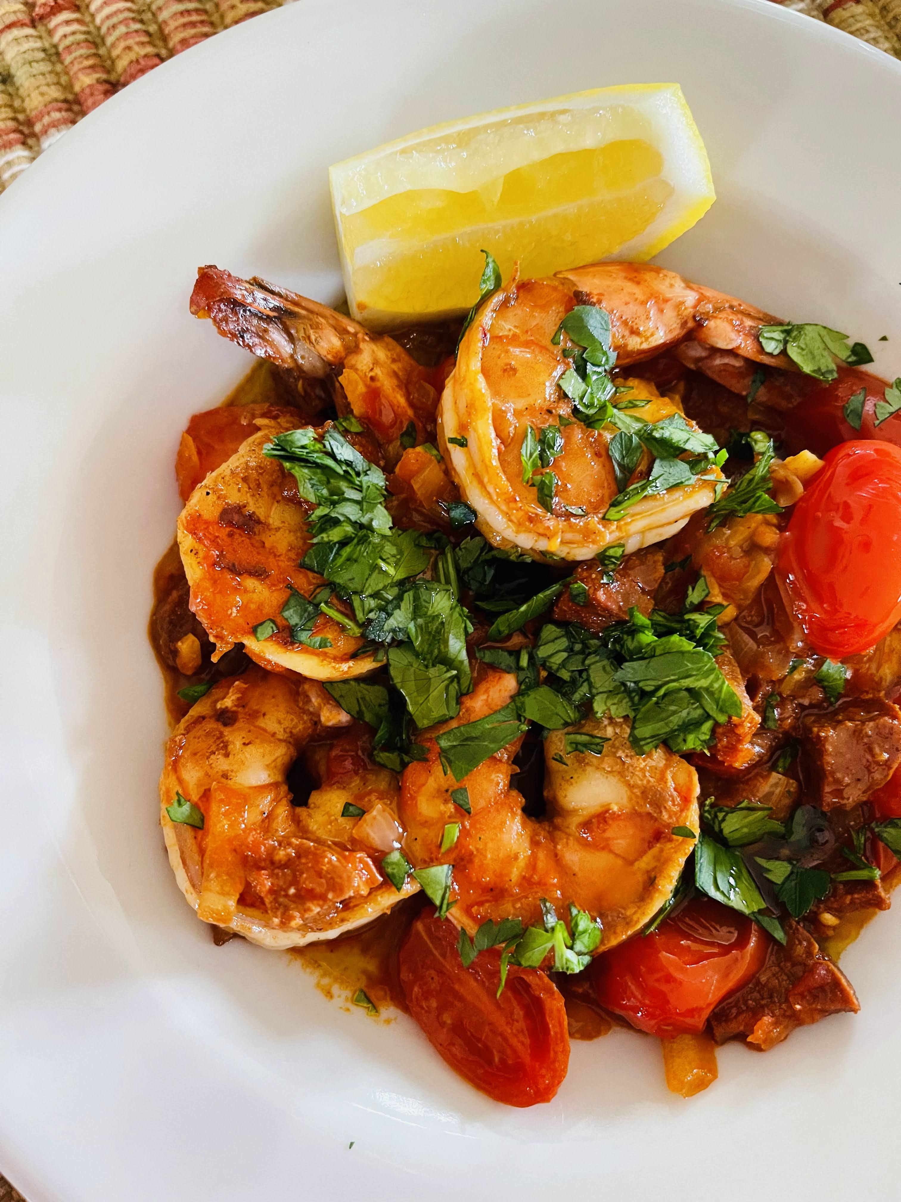 - Return the cooked shrimp and any juices to the pan and reheat for 1-2 minutes. Remove the pan from the heat and plate, garnishing with fresh chopped parsley and lemon wedges.