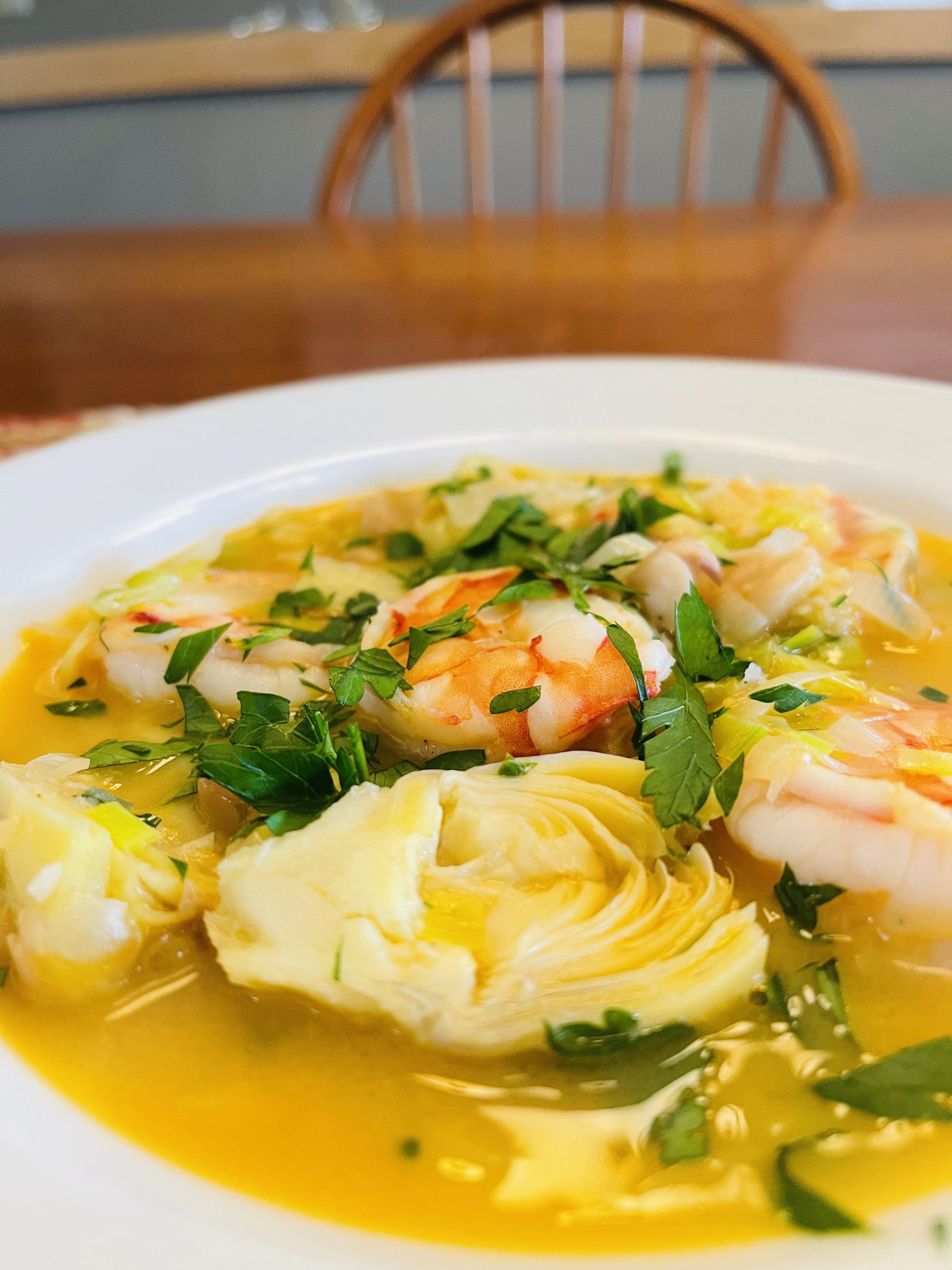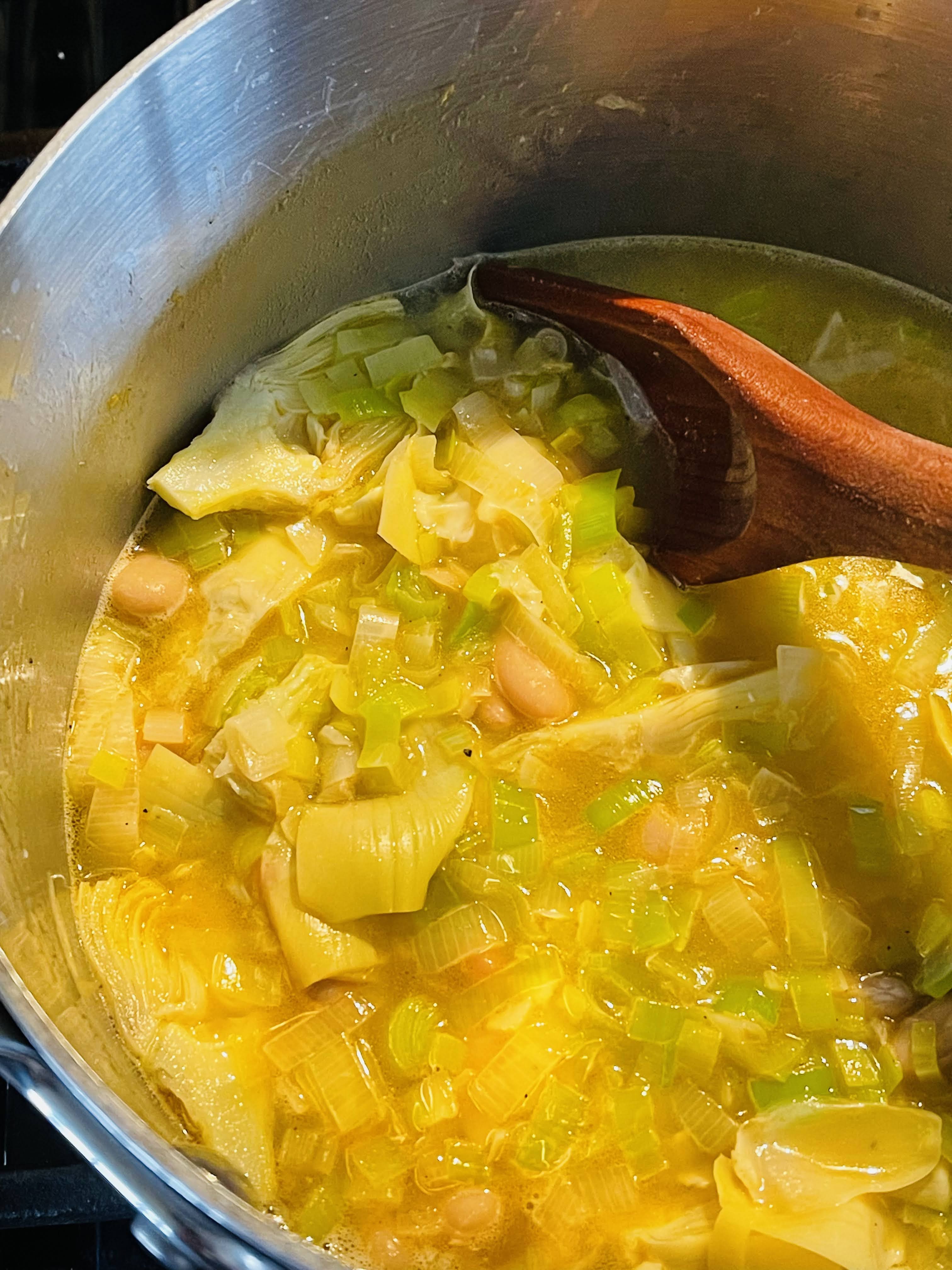 - Add leeks, season with salt & pepper, and cook over medium heat until leeks are soft and starting to brown on the edges, 4-5 minutes, stirring occasionally. Add beans, artichokes and stock. Bring to a boil over high heat. Lower heat and simmer 6-8 minutes. Remove from heat and stir in reserved shrimp and any juices from the plate, parsley and lemon juice. Garnish with additional chopped parsley.