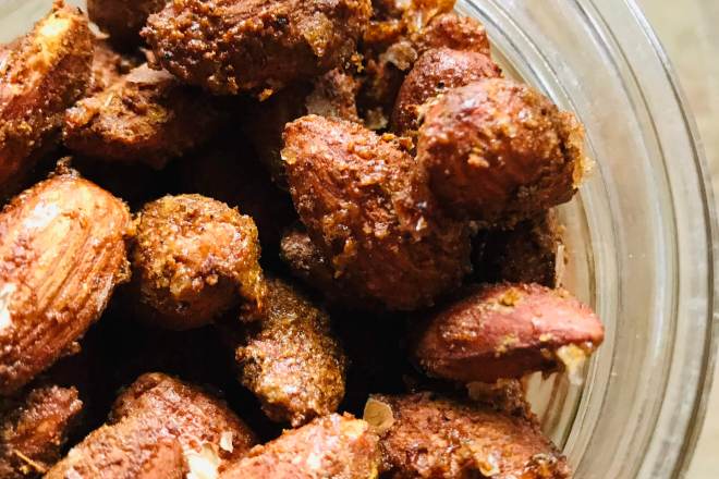 At our farm there are two times during the day that are sacrosanct, coffee hour and cocktail hour. The latter gets me thinking of a little something besides cheese and crackers. I came up with the perfect solution: Moroccan Almonds. Years ago I made my own Ras el Hanout (a North African spice mix) and have been using it on everything from cauliflower to lamb. I though why not use it with almonds? Almonds contain healthy fats, fiber, protein, magnesium and vitamin E. They can lower blood sugar, blood pressure and cholesterol; not to mention reduce hunger and promote weight loss. So if you stick to one serving which is 23 almonds or less, you’re in business!