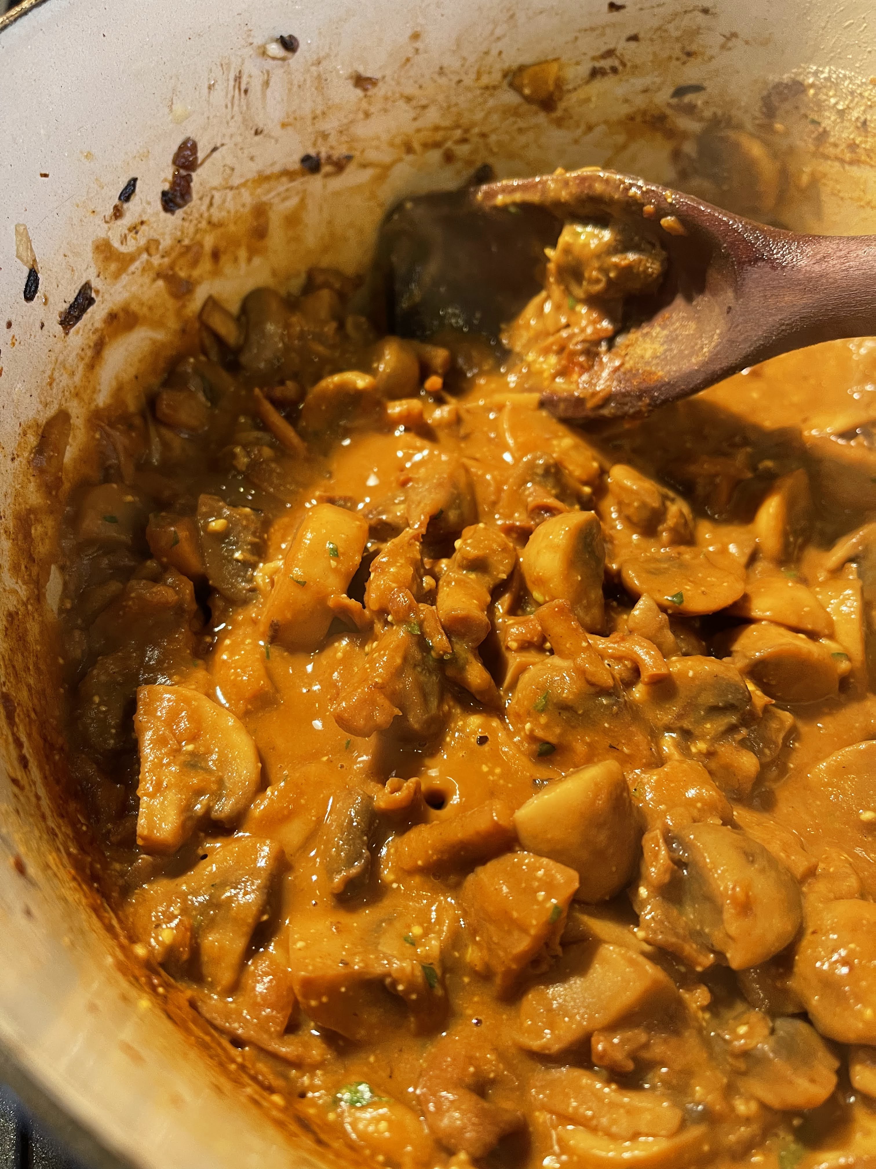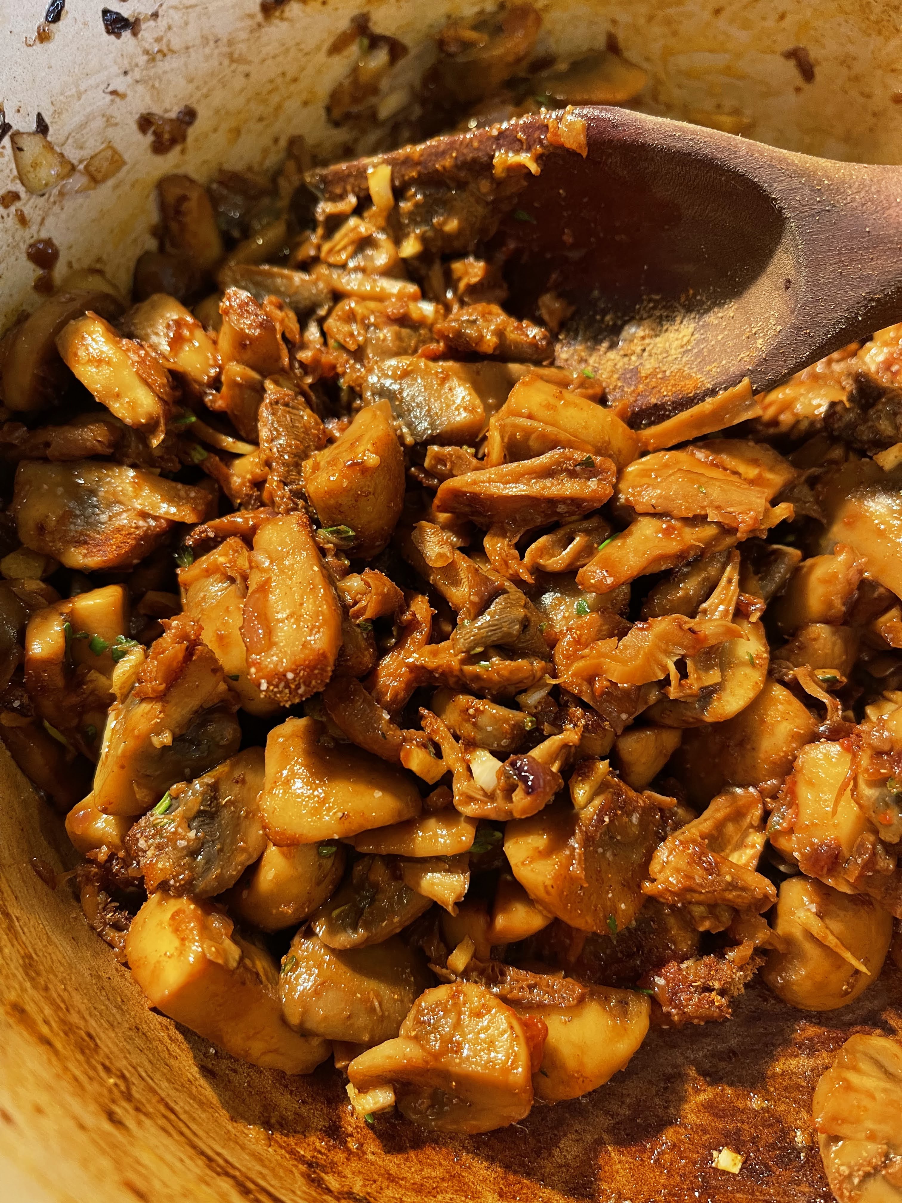 Pour all the mushrooms back into the pot, including the porcini’s, stir in the garlic and tomato paste, and cook until the garlic is fragrant, about 1-2 minutes. Then stir in the thyme, rosemary, 1 teaspoon of salt, coriander, and paprika and cook for 1 minute more.
