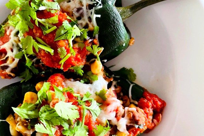 - Remove peppers from oven and spoon the remaining tomato sauce around the peppers. Fill each pepper with meat mixture, and cover with the tops of each pepper. Bake for an additional 25 minutes.